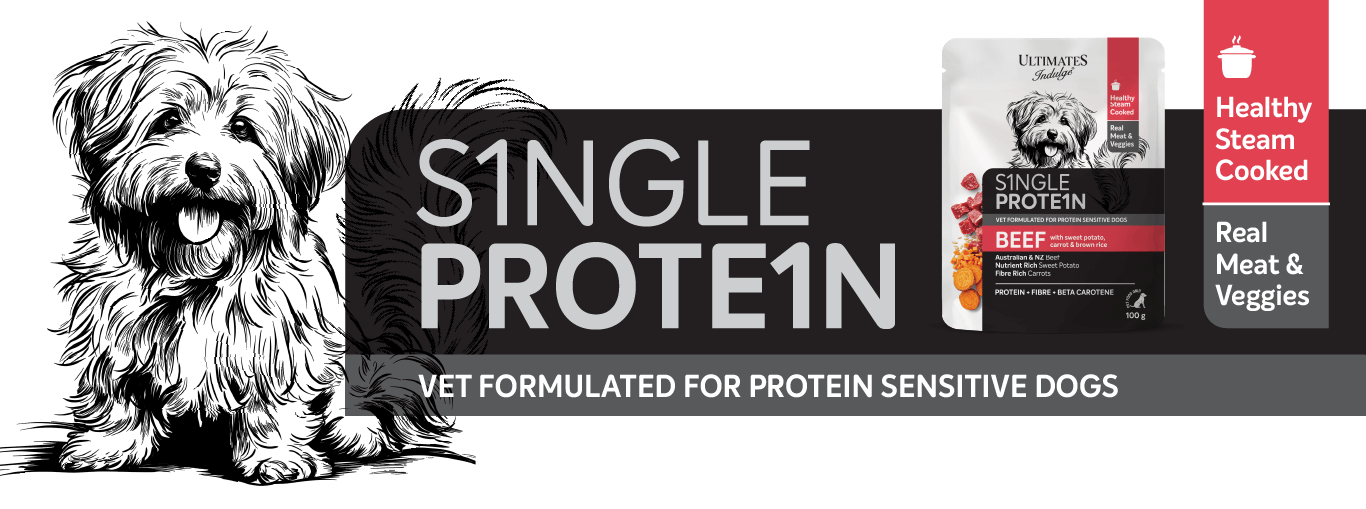 Try Ultimates Single Protein dog food, vet formulated, using one high-quality protein source to support dogs with food sensitivities. Made with nutrient-rich vegetables and gently steamed to preserve essential nutrients, this recipe promotes digestive health, sustained energy, and overall wellbeing.